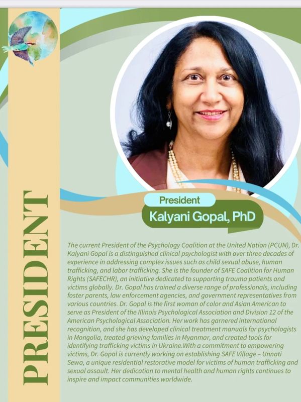 2024/2025: Global Level. President, Psychology Coalition at the United Nations of which APA is part of the Coalition of European, Asian, African MENA, the Americas.